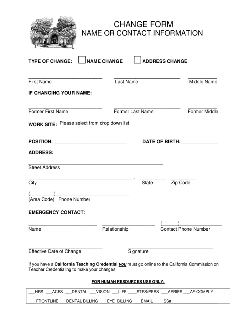 CHANGE FORM NAME OR CONTACT INFORMATIONTYPE OF CHANGE:NAME CHANGE First Headdress CHANGE Last Name Middle Name Former Last Name Former Middle IF CHANGING YOUR NAME: Former First Framework SITE: Please