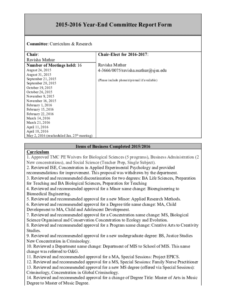 20152016 YearEnd Committee Report Form Committee: Curriculum & Research Chair: Ravish Mather Number of Meetings held: 16 August 24, 2015, August 31, 2015, September 21, 2015, September 28, 2015, October