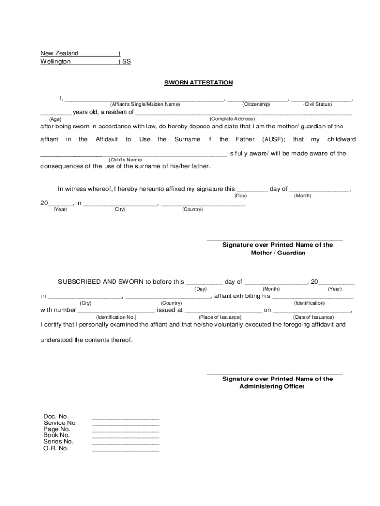 New Zealand Wellington)) SWORN ATTESTATION I,, ,, (Affronts Single/Maiden Name)(Citizenship)(Civil Status) years old, a resident of (Complete Address)(Age)after being sworn in accordance with law,