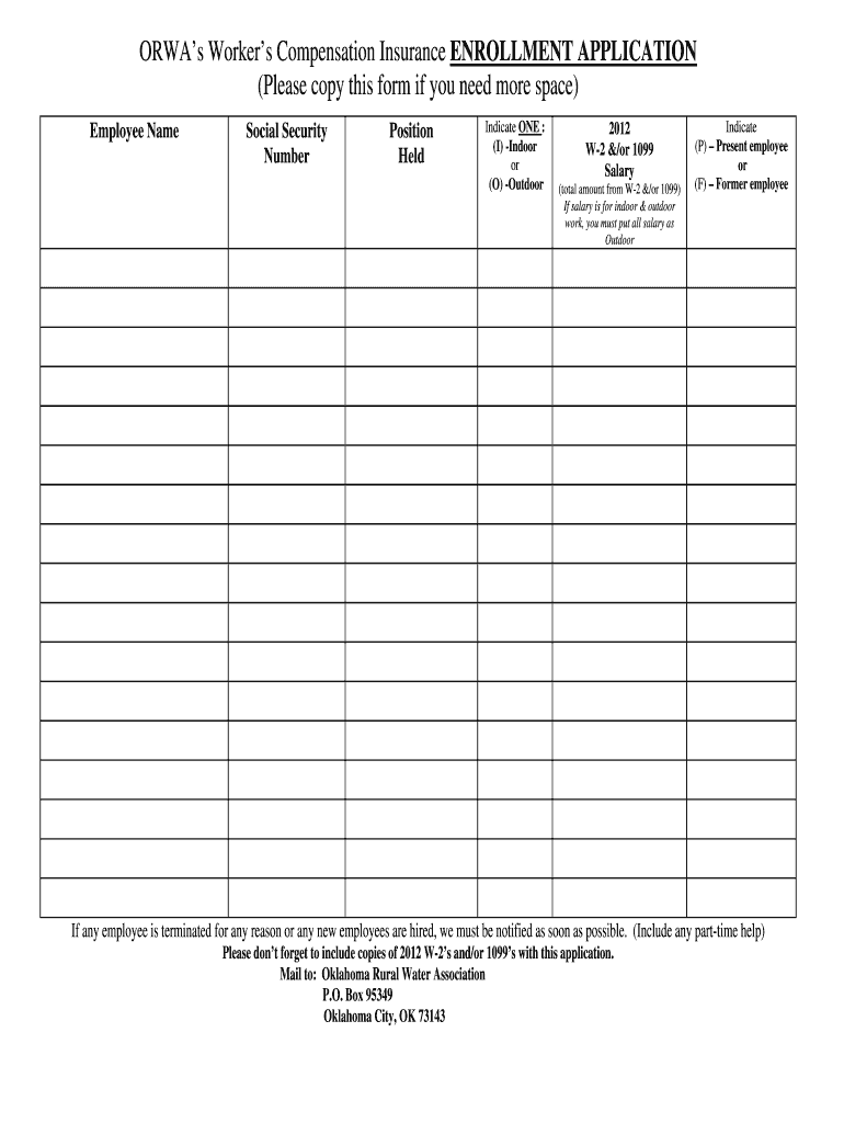 When filling out the Worker's Compensation Insurance Enrollment Application, you will need W-2s and/or 1099s for the year 2012. Ensure you have employee details ready before starting the application.