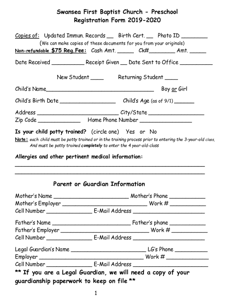 Swansea First Baptist Church Preschool Registration Form 20192020 Copies of: Updated Immune. Records Birth Cert. Photo ID (We can make copies of these documents for you from your originals) Nonrefundable