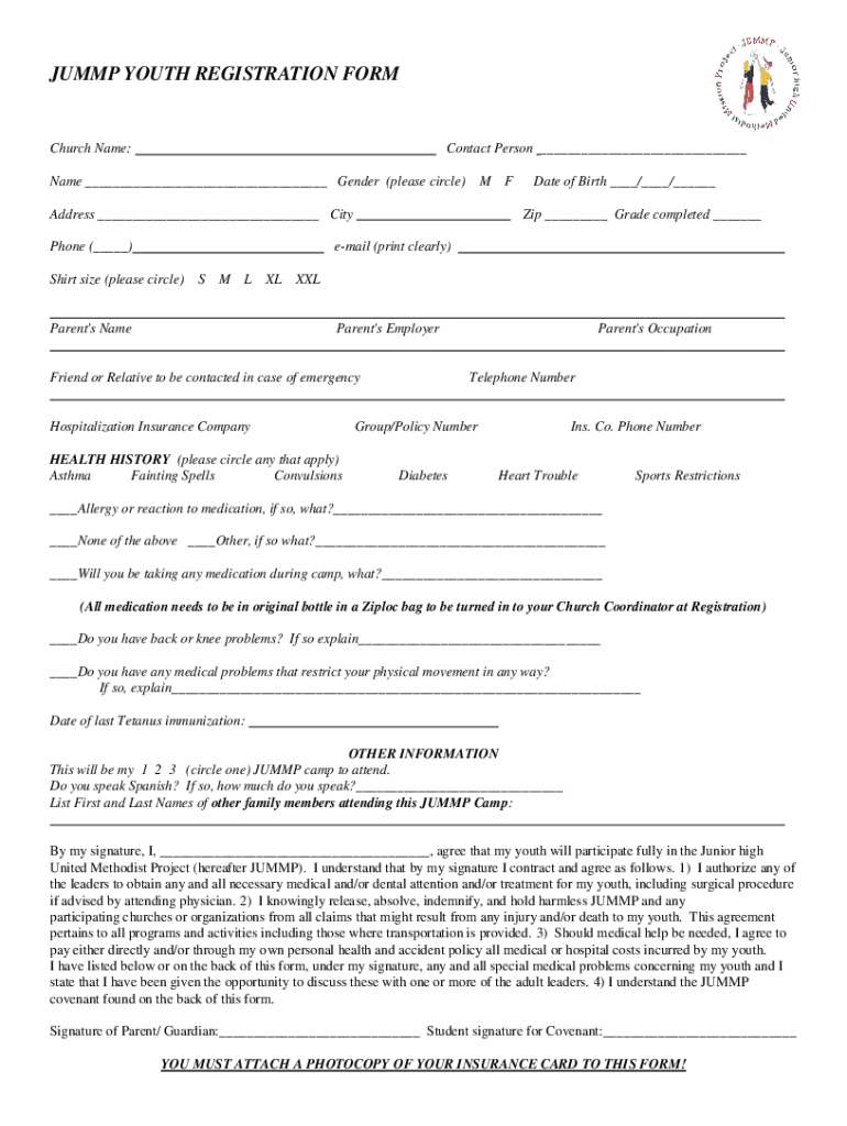 Get the free JUMMP YOUTH REGISTRATION FORM(circle camp week attending)