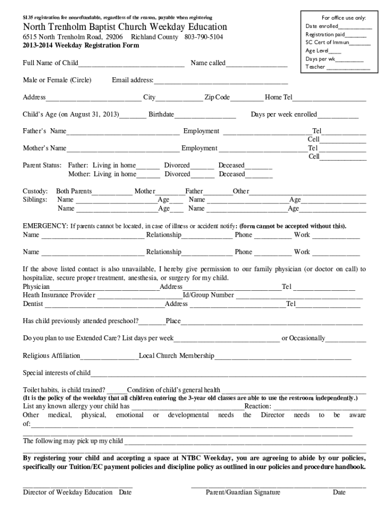 $135 registration fee nonrefundable, regardless of the reason, payable when registering North Threshold Baptist Church Weekday Education 6515 North Threshold Road, 29206 Richland County 8037905104
