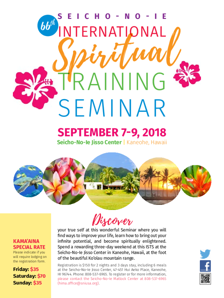 66thS E I C H O N O I International an u t i Sp IR TRAINING SEMINARSEPTEMBER 79, 2018SeichoNoIe Kiss Center Kaneohe, HawaiiDiscoverKAMAAINA SPECIAL RATE your true self at this wonderful Seminar where