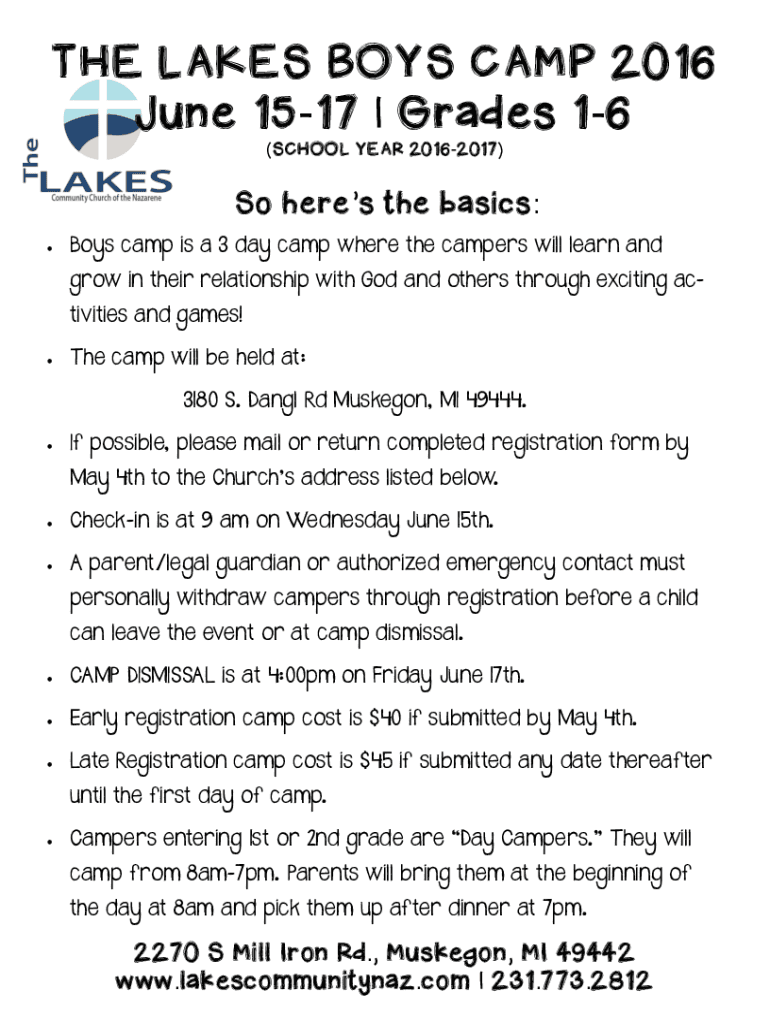 THE LAKES BOYS CAMP 2016 June 1517 Grades 16 (SCHOOL YEAR 20162017)So here's the basics: Boys camp is a 3-day camp where the campers will learn and grow in their relationship with God and others through