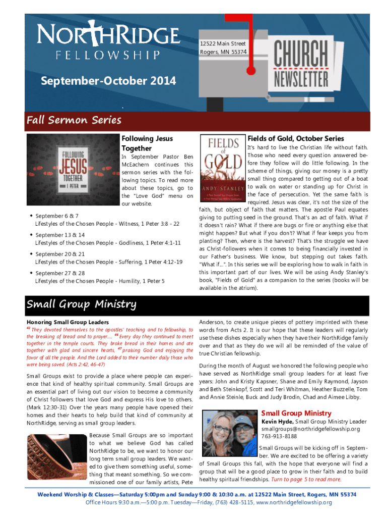 12522 Main Street Rogers, MN 55374SeptemberOctober 2014 Fall Sermon Series Following Jesus Together In September Pastor Ben Teacher continues this sermon series with the following topics. To read