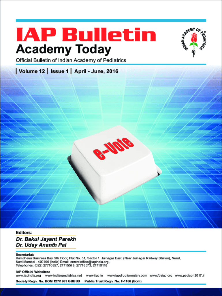 IAP Bulletin Academy TodayOfficial Bulletin of Indian Academy of Pediatrics Volume 12Issue 1April June, 2016Editors:Dr. Baku Jay ant Parekh Dr. Day Ana nth Pie Secretariat: Camden Business Bay, 5th