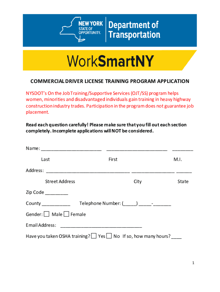 COMMERCIAL DRIVER LICENSE TRAINING PROGRAM APPLICATION Shots On the Job Training/Supportive Services (OUT/SS) program helps women, minorities and disadvantaged individuals gain training in heavy highway