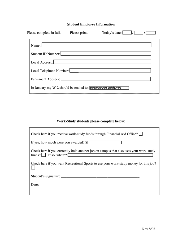 The Student Employee Information Form serves as an essential document for collecting personal and employment details from student employees. This form captures critical information, including the student’s name, student ID, contact details, and specifics about their campus jobs. It is particularly important for work-study students, as it helps verify eligibility for financial aid and establishes employment records. The accurate completion of this form is crucial for both students and the institution.