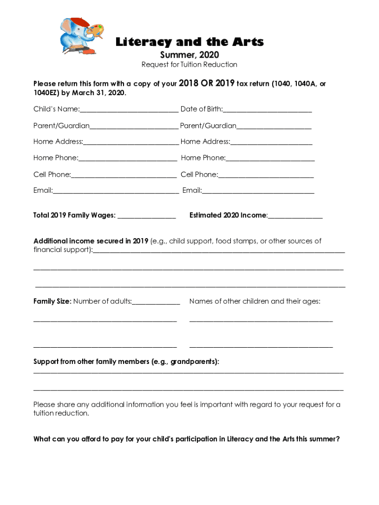 Literacy and the Arts Summer, 2020 Request for Tuition ReductionPlease return this form with a copy of your 2018 1040EZ) by March 31, 2020.OR 2019 tax return (1040, 1040A, orchids Name: Date of Birth: