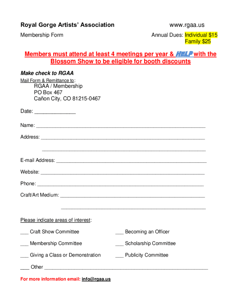 Royal Gorge Artists Association Membership Form.raga.us Annual Dues: Individual $15 Family $25Members must attend at least 4 meetings per year & HELP with the Blossom Show to be eligible for booth