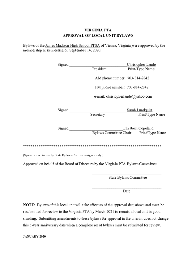 VIRGINIA PTA APPROVAL OF LOCAL UNIT BYLAWS of the James Madison High School PSA of Vienna, Virginia were approved by the membership at its meeting on September 14, 2020. Signed: Christopher Land President