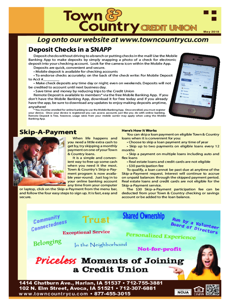 May 2018Log onto our website at www.towncountrycu.com Deposit Checks in a SNAP Deposit checks without driving to a branch or putting checks in the mail! Use the Mobile Banking App to make deposits