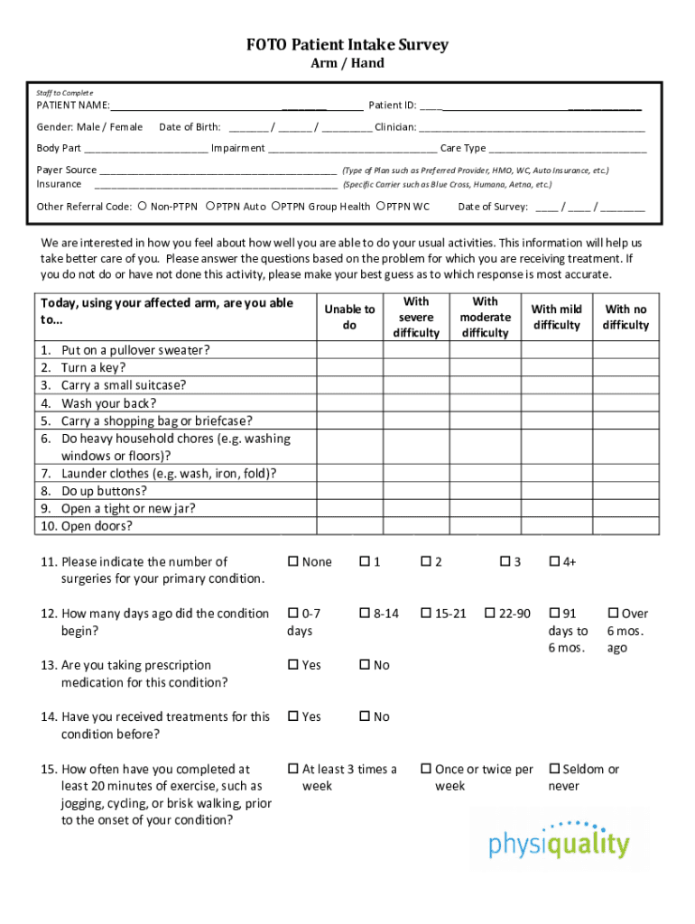 FOTOPatientIntakeSurvey Arm/Hand StafftoComplete PATIENTNAME: Patient ID: Gender:Male/Female DateofBirth: / / Clinician: Bodyguard Impairment Carlyle PayerSource (TypeofPlansuchasPreferredProvider,