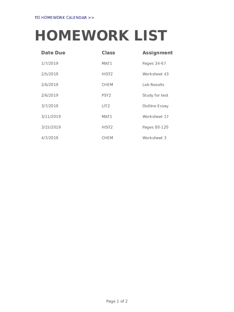 Date DueClassAssignment1/7/2019MAT1Pages 34672/5/2019HIST2Worksheet 432/6/2019CHEMLab Results2/6/2019PSY2Study for test3/7/2019LIT2Outline Essay3/11/2019MAT1Worksheet