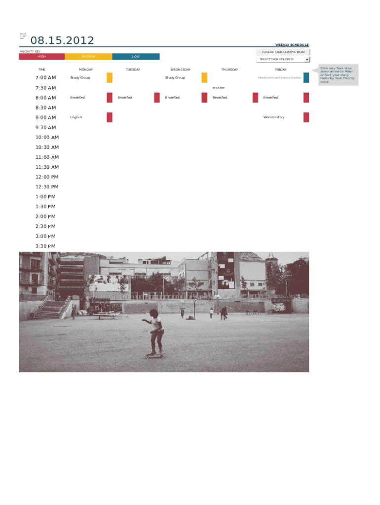 ING08.15.2012WEEKLY SCHEDULEPRIORITY KEY:TOGGLE TASK COMPLETIONHIGHTIME7:00 AMMEDIUMLOWSELECT TASK PRIORITYStudy GroupStudy Group7:30 AM