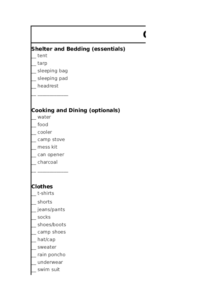The Camping Inventory Checklist is a personal form used by individuals and families to prepare for a camping trip by organizing essential and optional items needed for their adventure.