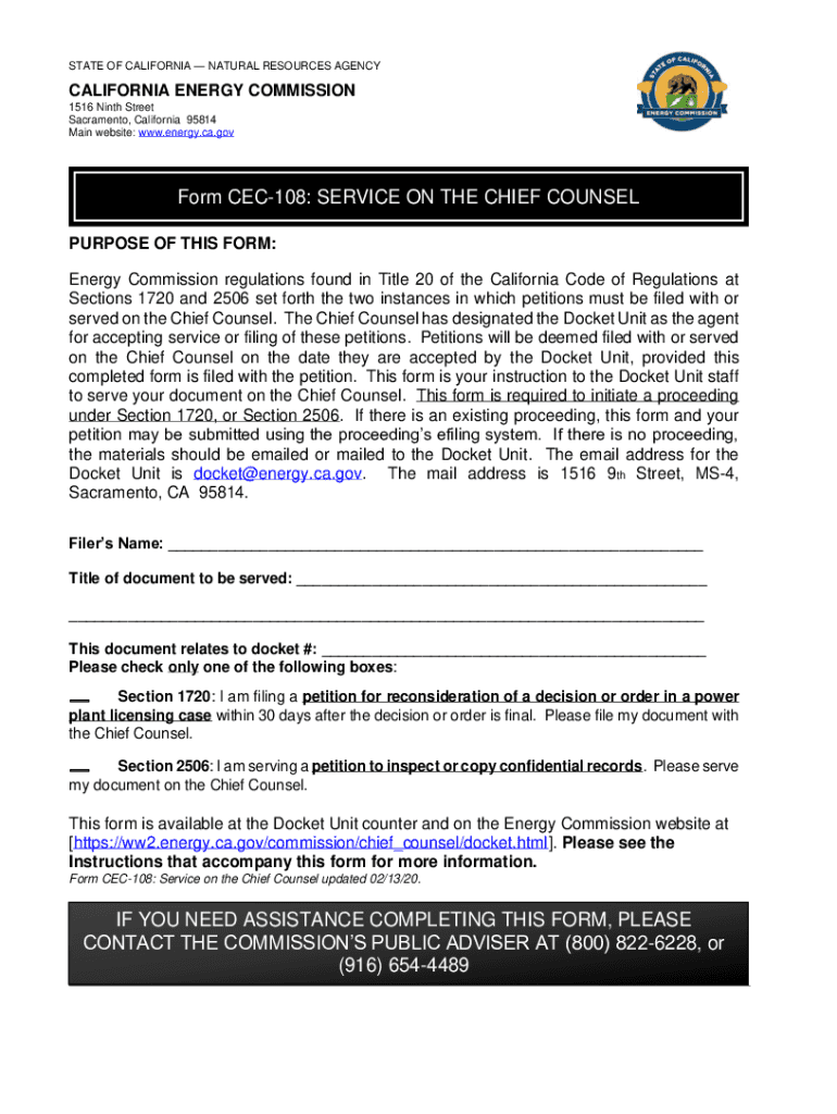 STATE OF CALIFORNIA NATURAL RESOURCES AGENCYCALIFORNIA ENERGY COMMISSION 1516 Ninth Street Sacramento, California 95814 Main website: www.energy.ca.govForm CEC108: SERVICE ON THE CHIEF COUNSEL PURPOSE