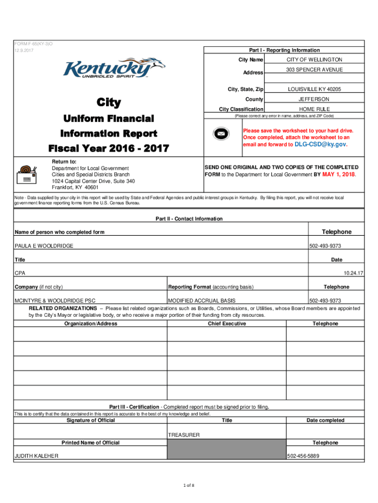 FORM F65(KY3)Part I'm Reporting Information12.9.2017City Name Address City, State, SimCity Uniform Financially OF WELLINGTON 303 SPENCER AVENUELOUISVILLE KY 40205CountyJEFFERSONCity ClassificationHOME