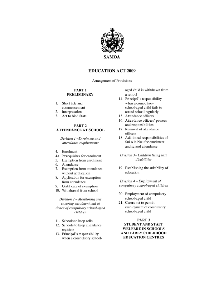 SAMOA EDUCATION ACT 2009 Arrangement of Provisions PART 1 PRELIMINARY 14. 1. 2. 3. Short title and commencement Interpretation Act to bind Statement 2 ATTENDANCE AT SCHOOL Division 1 Enrollment and