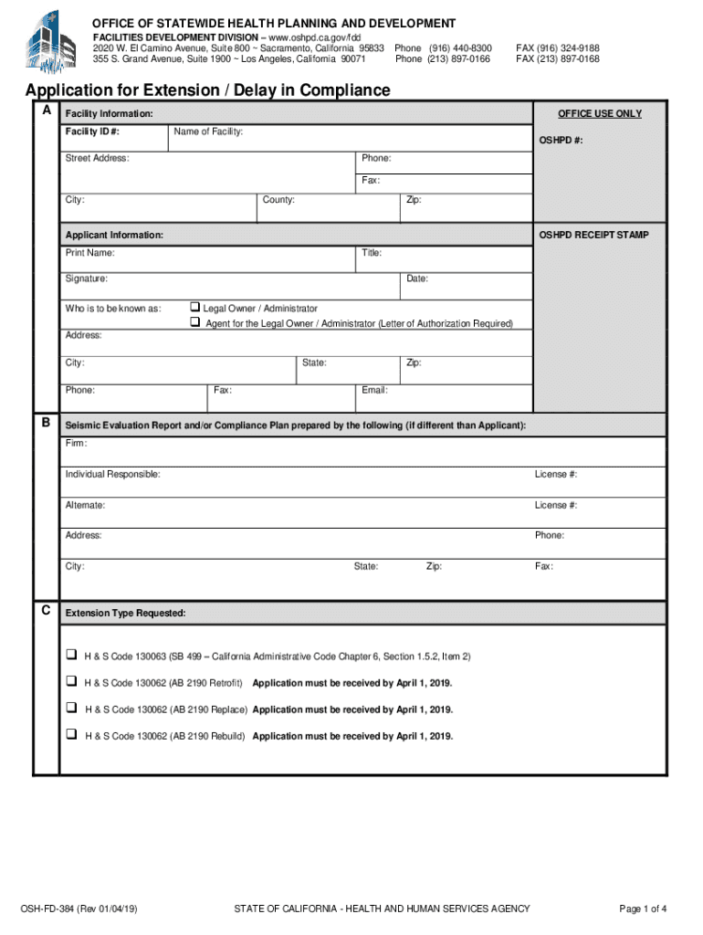 Healthcare facilities in California are subject to stringent seismic safety regulations that necessitate ongoing evaluation and compliance efforts. The OSH-FD-384 form is necessary for obtaining an extension to these compliance deadlines, which can be critical for facility operations during periods of significant construction or renovation.