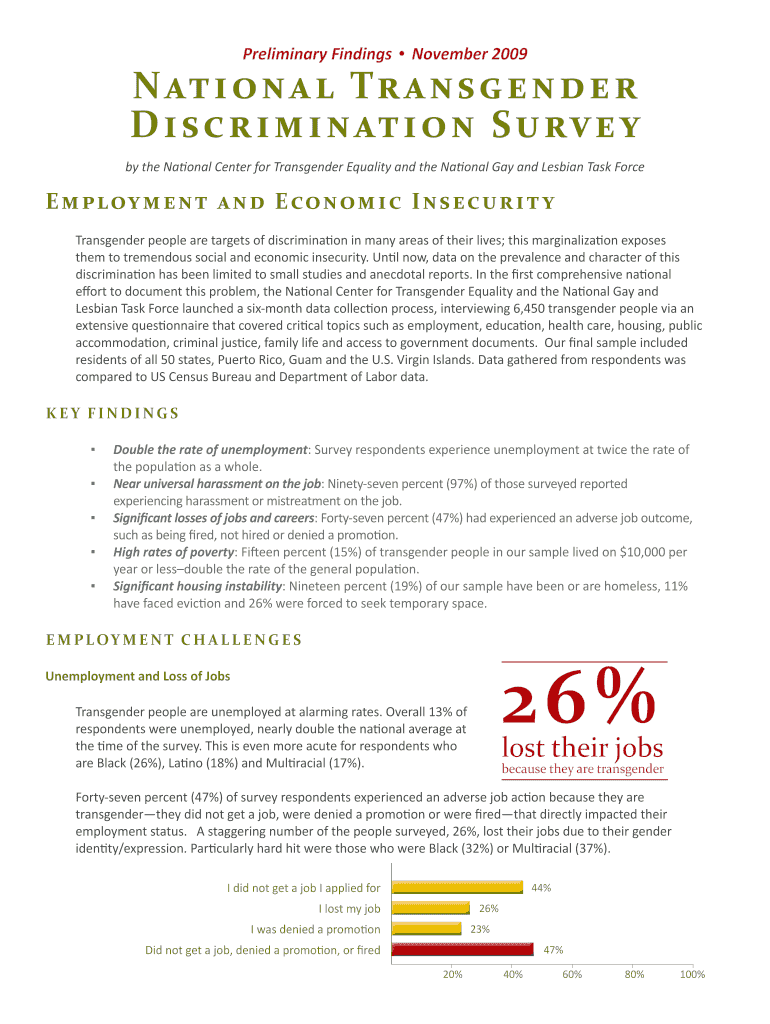 Preliminary Findings November 2009National Transgender Discrimination Survey by the National Center for Transgender Equality and the National Gay and Lesbian Task ForceEmploym en t an n d E con on