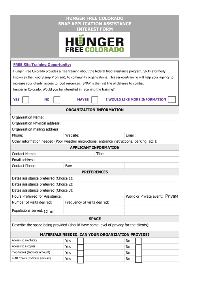 HUNGER FREE COLORADO SNAP APPLICATION ASSISTANCE INTEREST FORM FREE Site Training Opportunity: Hunger Free Colorado provides a free training about the federal food assistance program, SNAP (formerly