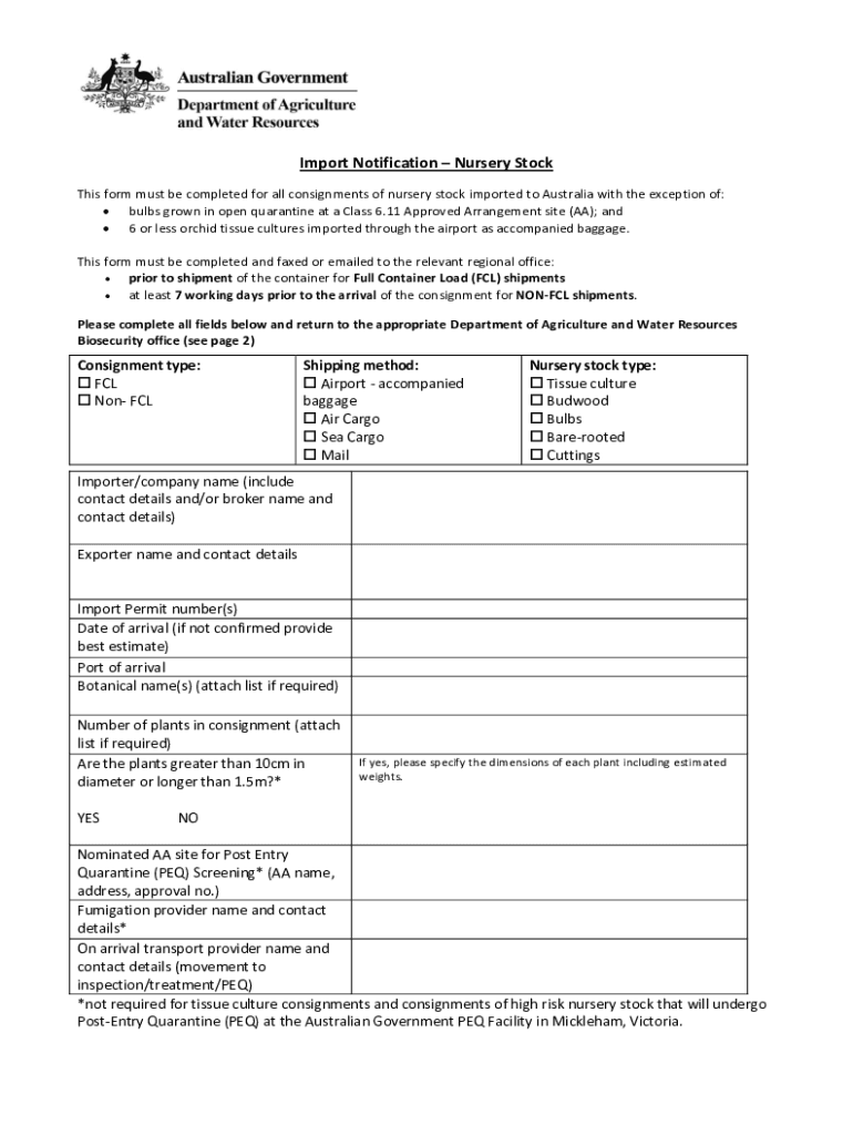Import Notification Nursery Stock This form must be completed for all consignments of nursery stock imported to Australia except: bulbs grown in open quarantine at a Class 6.11 Approved Arrangement