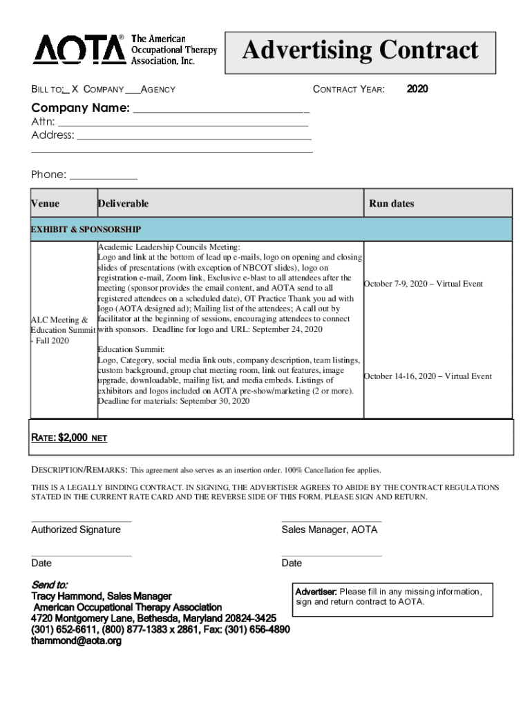Advertising Contractile TO: X COMPANY AGENCYCONTRACT YEAR:2020Company Name: Attn: Address: Phone: VenueDeliverableRun datesEXHIBIT & SPONSORSHIP Academic Leadership Councils Meeting: Logo and link