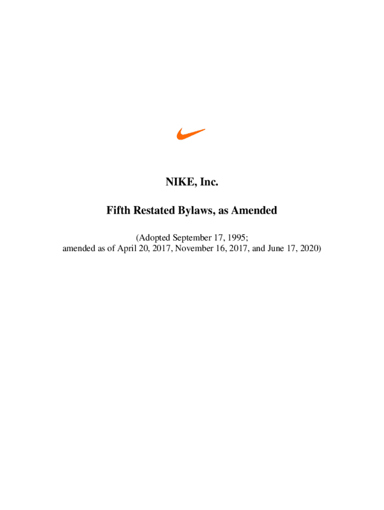 S NIKE, Inc. Fifth Restated Bylaws, as Amended (Adopted September 17, 1995; amended as of April 20, 2017, November 16, 2017, and June 17, 2020)NIKE, Inc. Fifth Restated Bylaws, as Amended ARTICLE