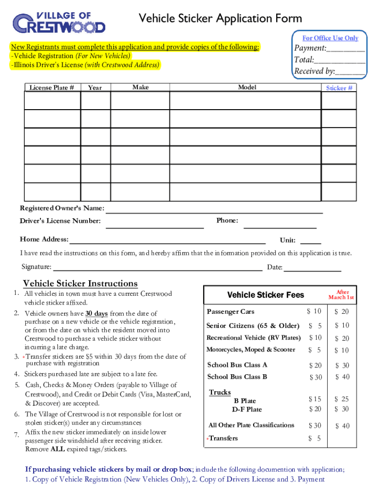 Vehicle Sticker Application Form For Office Use Online Registrants must complete this application and provide copies of the following: Vehicle Registration (For New Vehicles) Illinois Driver's License