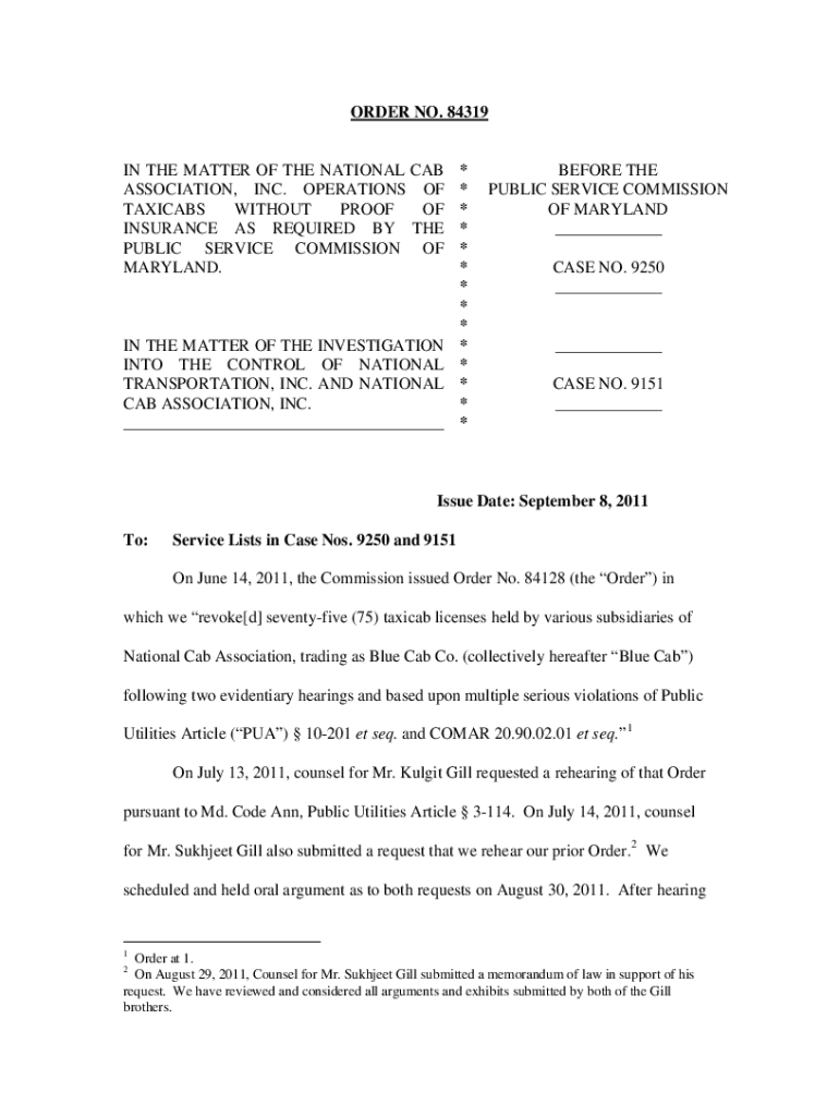 ORDER NO. 84319IN THE MATTER OF THE NATIONAL CAB ASSOCIATION, INC. OPERATIONS OF TAXICABS WITHOUT PROOF OF INSURANCE AS REQUIRED BY THE PUBLIC SERVICE COMMISSION OF MARYLAND.IN THE MATTER OF THE INVESTIGATION