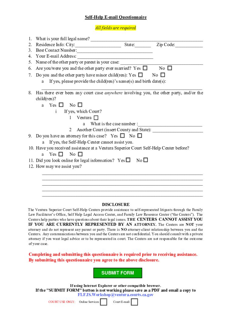 To fill out the self-help e-mail questionnaire, one should read the instructions carefully, provide accurate information for each question, and ensure that all required fields are completed before submission.