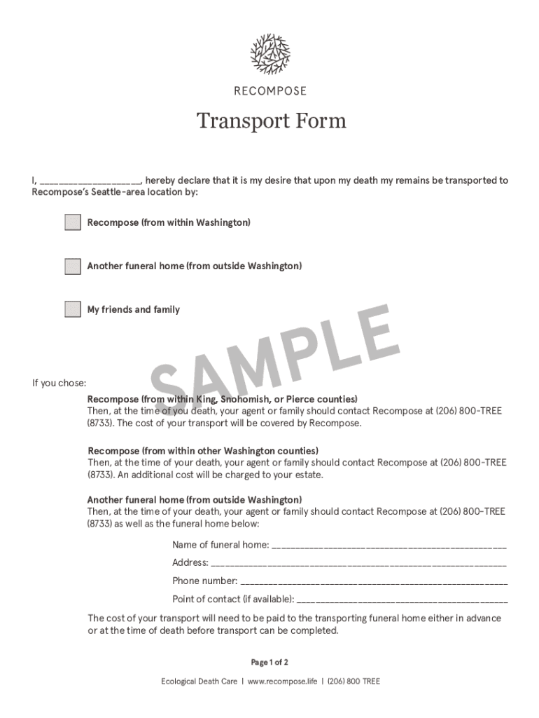 Transport Form I, hereby declare that it is my desire that upon my death my remains be transported to Recompose Seattle area location by: Recompose (from within Washington)Another funeral home (from