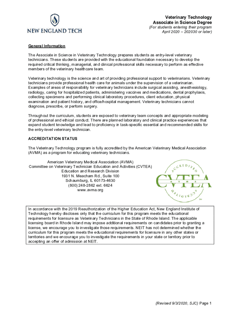 Veterinary Technology Associate in Science Degree(For students entering their program April 2020 202030 or later) General Information The Associate in Science in Veterinary Technology prepares students