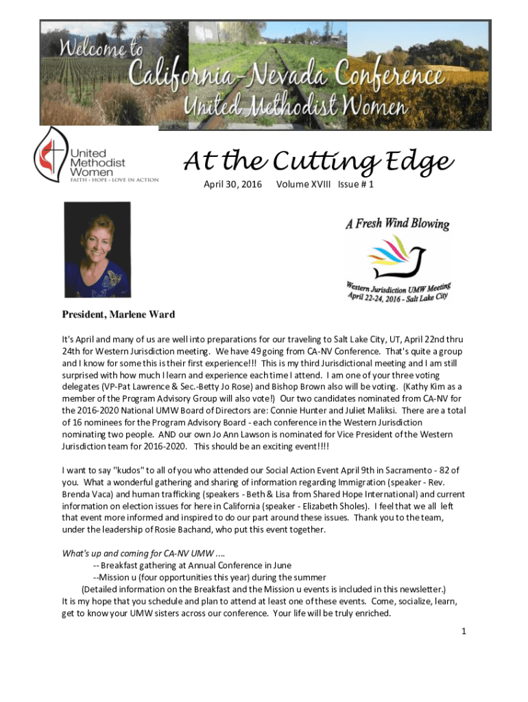 At the Cutting Edge April 30, 2016Volume XVIII Issue # 1President, Marlene Ward It's April and many of us are well into preparations for our traveling to Salt Lake City, UT, April 22nd through 24th