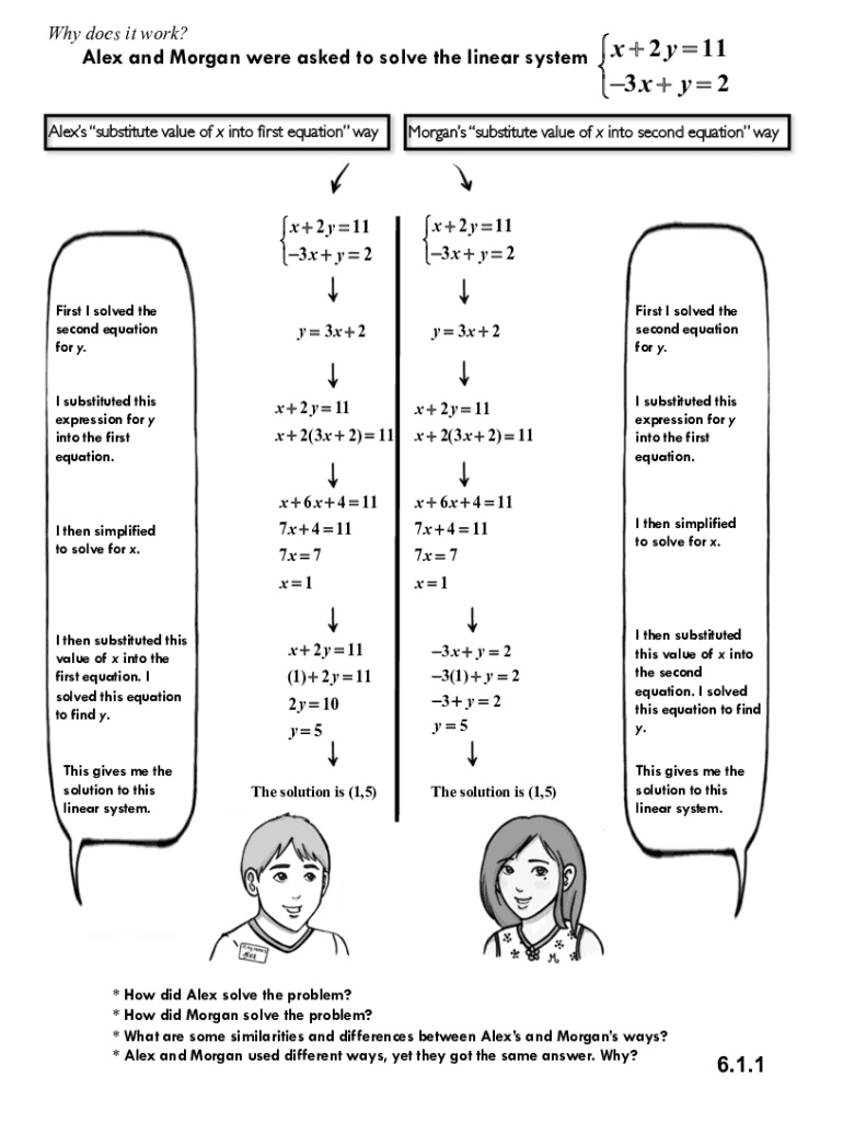 Why does it work? Alex and Morgan were asked to solve the linear system x + 2 y 11 3x + y 2Alexs substitute value of x into first equation way x + 2 y 11 3x + y 2 First I solved the second equation