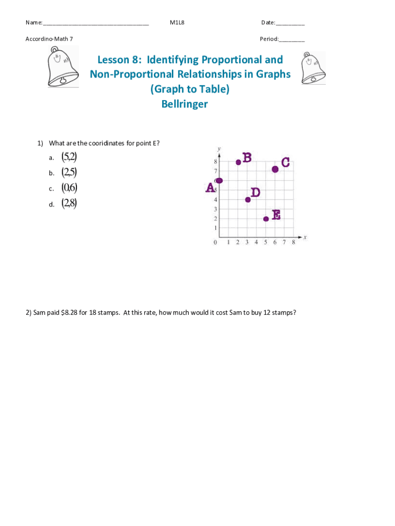 Name: AccordinoMath 7M1L8Date: Period: Lesson 8: Identifying Proportional and Proportional Relationships in Graphs (Graph to Table) Bell ringer 1) What are the coordinates for point E? a. b. c. d.5,2
