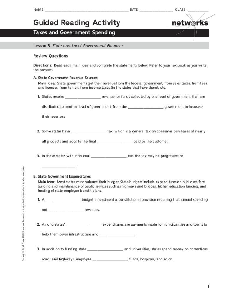 NAME DATE CLASS Guided Reading Activity Taxes and Government Spending Lesson 3 State and Local Government Finances Review Questions Directions: Read each main idea and complete the statements below.
