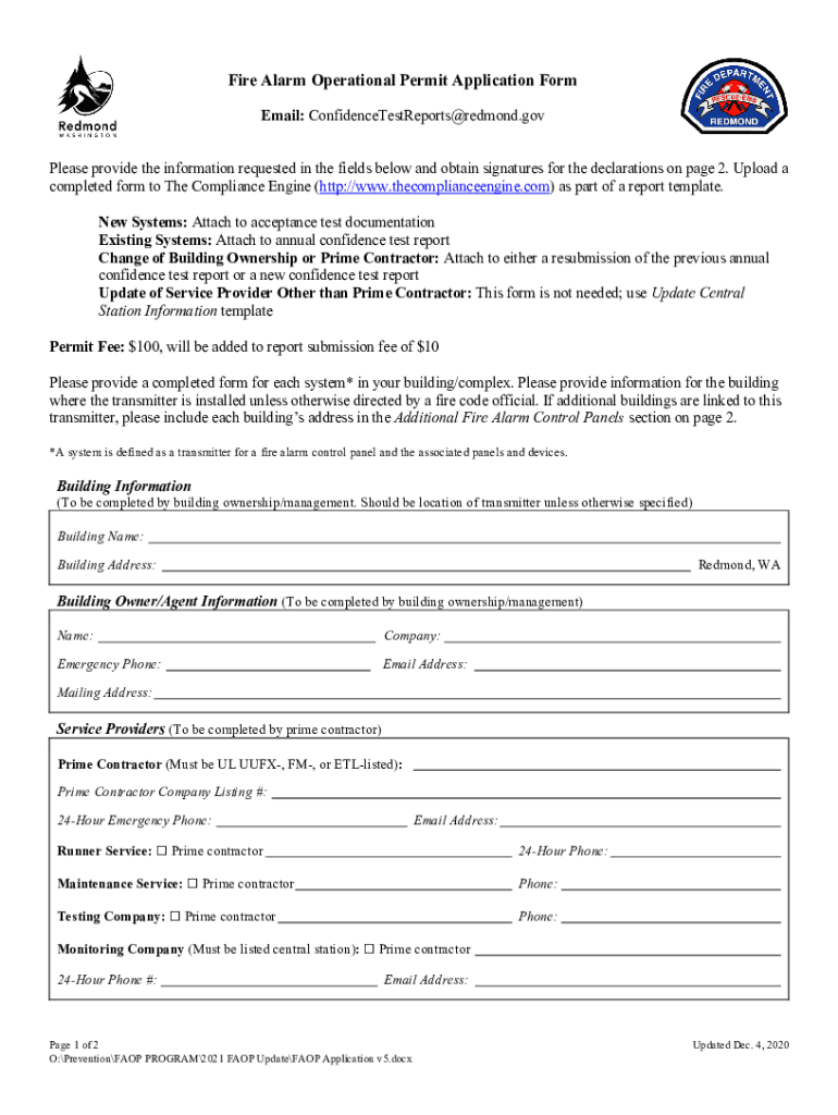Get the free Fire Alarm Operational Permit Application Form - Redmond.gov