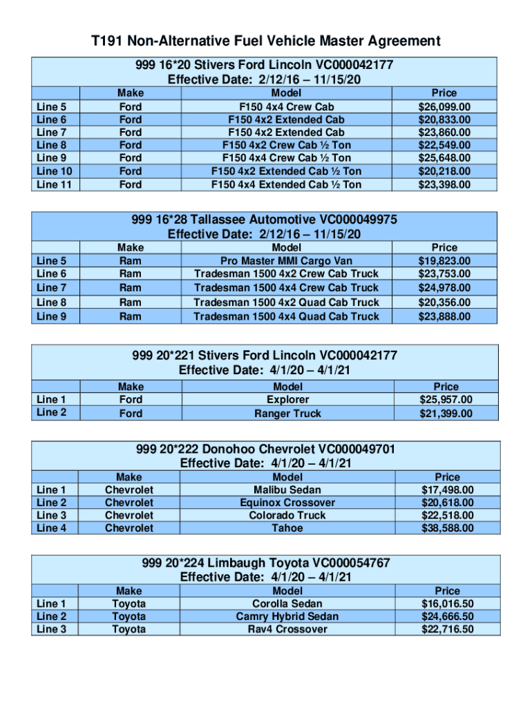 T191 Alternative Fuel Vehicle Master Agreement 999 16×20 Shivers Ford Lincoln VC000042177 Effective Date: 2/12/16 11/15/20 Line 5 Line 6 Line 7 Line 8 Line 9 Line 10 Line 11Make Ford Remodel F150