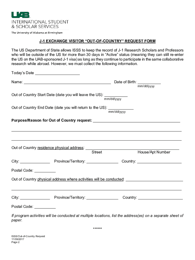 Get the free Download the Out Of Country request form (pdf) - UAB