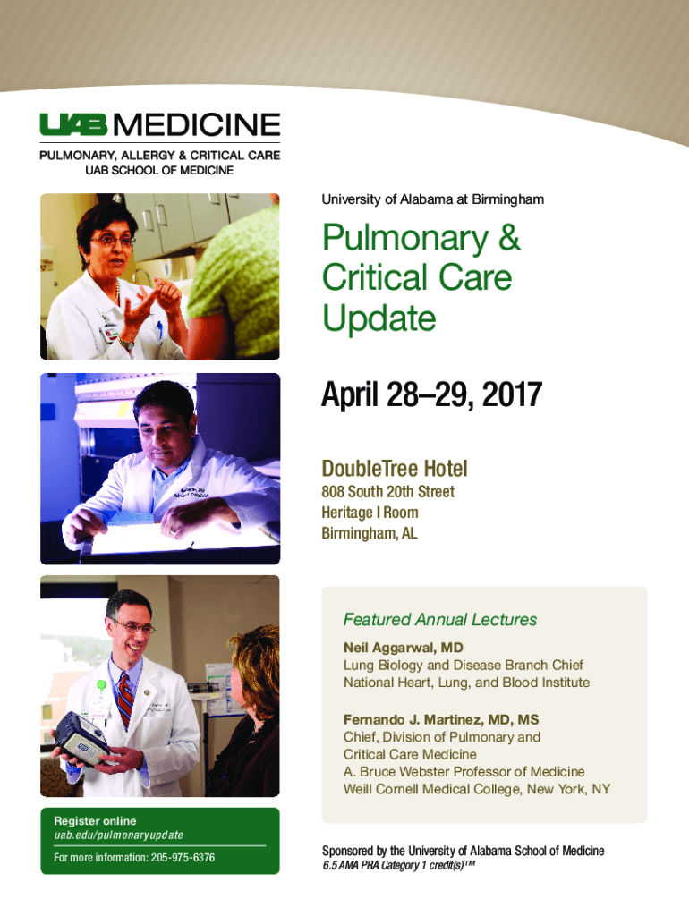 University of Alabama at BirminghamPulmonary & Critical Care Update April 2829, 2017 Doublet Hotel 808 South 20th Street Heritage I Room Birmingham, Featured Annual Lectures Neil Aggarwal, MD Lung
