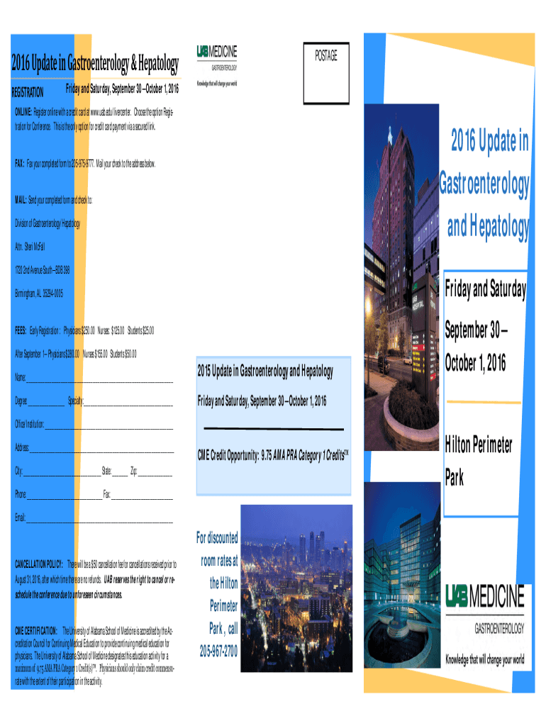 POSTAGE2016 Update in Gastroenterology & Hepatology REGISTRATION Friday and Saturday, September 30October 1, 2016ONLINE: Register online with a credit card at www.uab.edu/livercenter. Choose the option