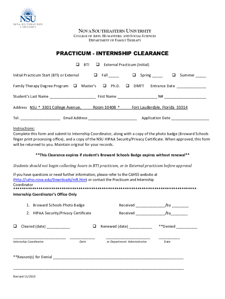 NOVA SOUTHEASTERN UNIVERSITYCOLLEGE OF ARTS, HUMANITIES, AND SOCIAL SCIENCES DEPARTMENT OF FAMILY THERAPYPRACTICUM INTERNSHIP CLEARANCE Befall Initial Practicum Start (BTI) or External Family Therapy