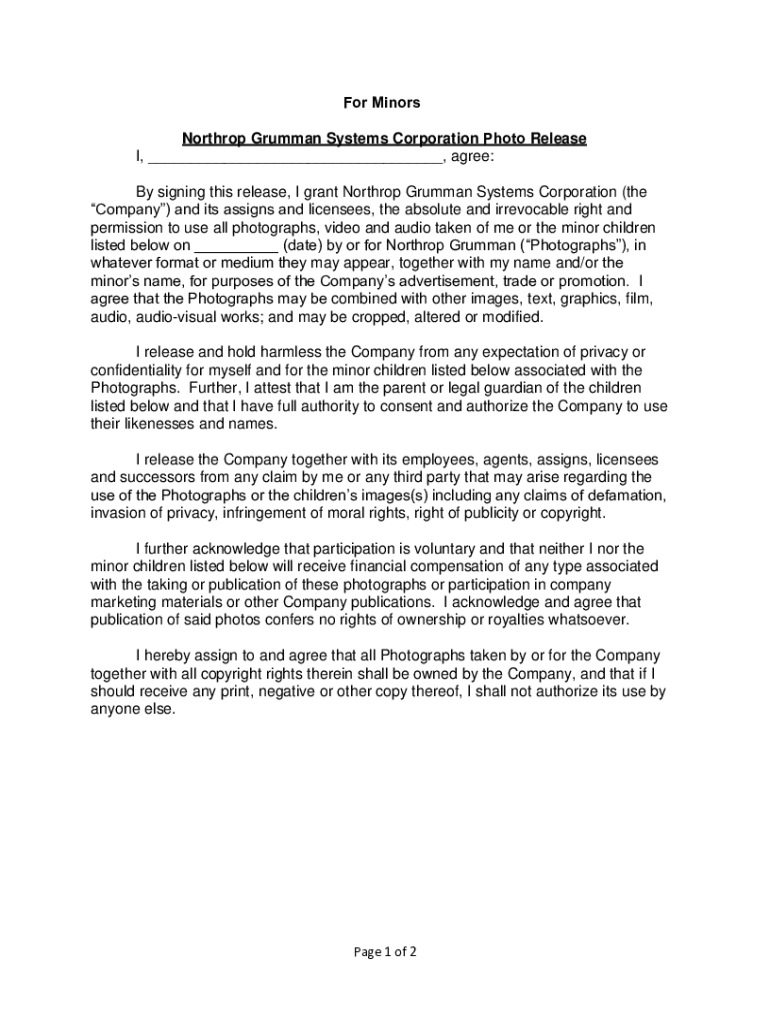For Minors Northrop Grumman Systems Corporation Photo Release I, agree: By signing this release, I grant Northrop Grumman Systems Corporation (the Company) and its assigns and licensees, the absolute