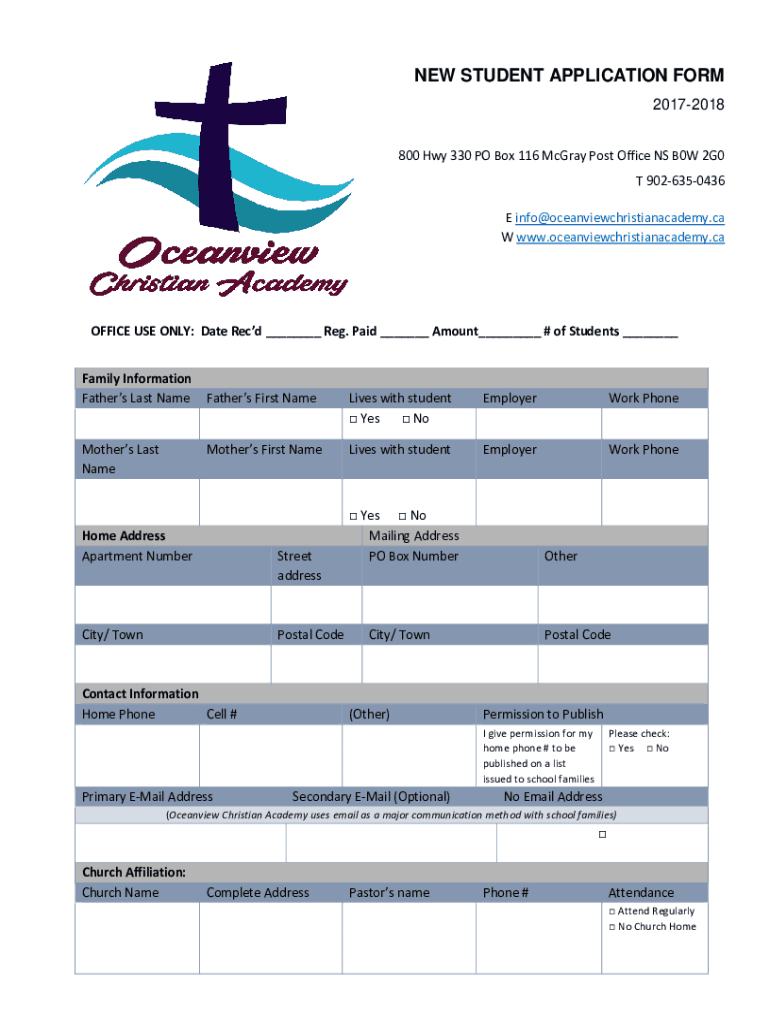NEW STUDENT APPLICATION FORM 20172018 800 Hwy 330 PO Box 116 McCray Post Office NS B0W 2G0 T 9026350436 E info oceanviewchristianacademy.ca W www.oceanviewchristianacademy.caOFFICE USE ONLY: Date
