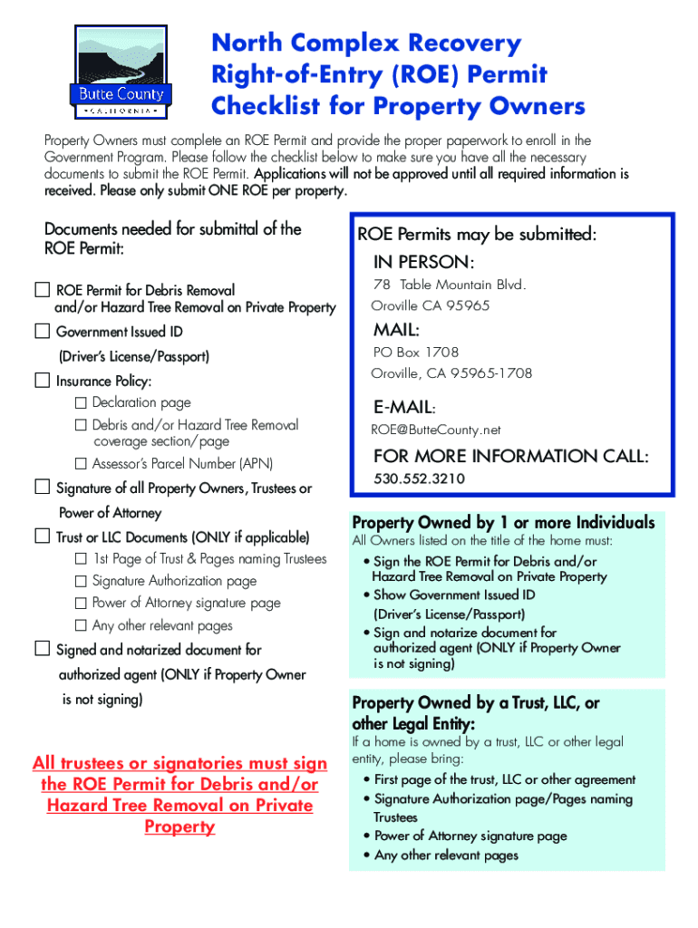 North Complex Recovery RightofEntry (ROE) Permit Checklist for Property Owners must complete an ROE Permit and provide the proper paperwork to enroll in the Government Program. Please follow the checklist