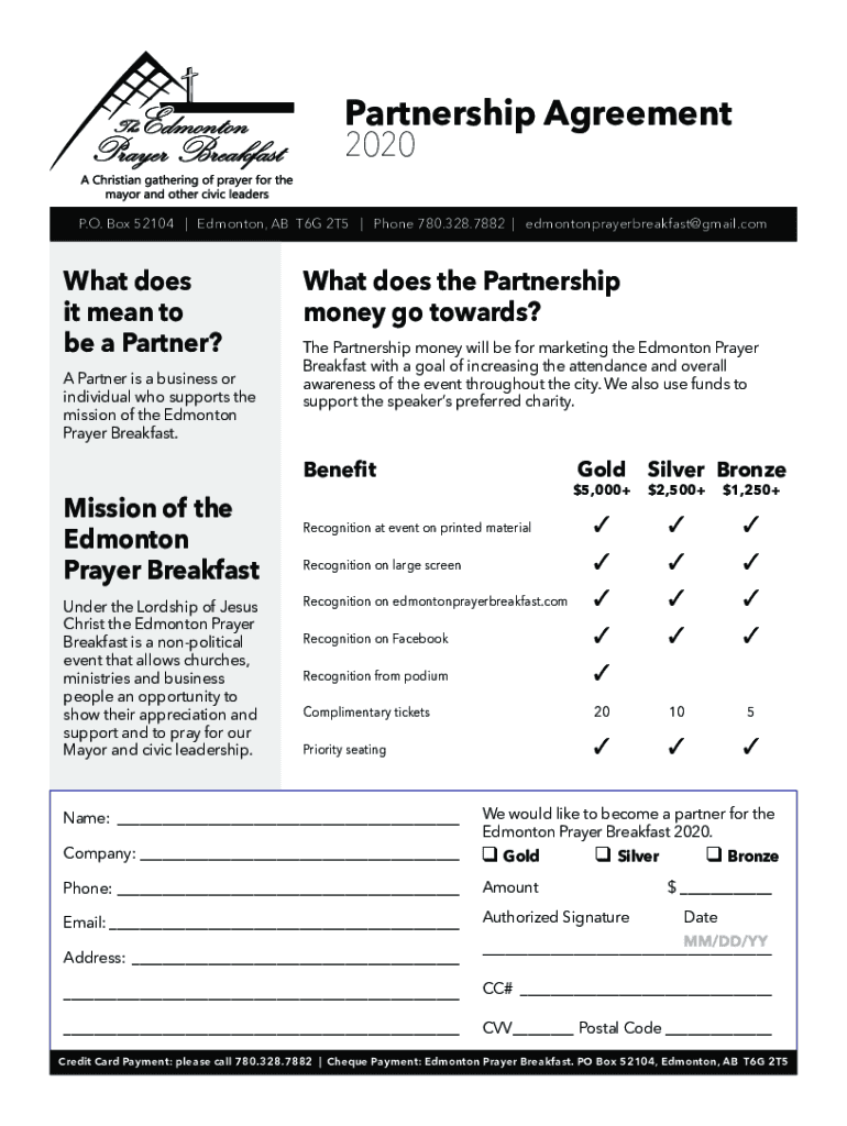 Partnership Agreement 2020P. O. Box 52104 Edmonton, AB T6G 2T5 Phone 780.328.7882 edmontonprayerbreakfast Gmail. Combat does it mean to be a Partner? A Partner is a business or individual who supports