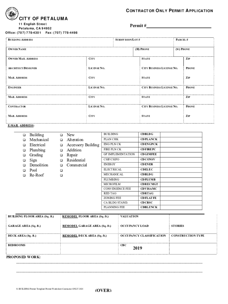 CONTRACTOR ONLY PERMIT APPLICATION CITY OF PETALUMA 11 English Street Petaluma, CA 94952 Office: (707) 7784301 Fax: (707) 7784498Permit # BUILDING ADDRESSSUBDIVISION/LOT #OWNER NAMESPACE #(H) PHONE(W)
